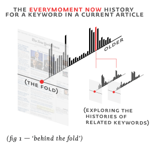 If stories 'above the fold' are important and those 'below the fold' secondary, then Everymoment Now is looking 'behind the fold'; (fig 1) that is laterally, through time. Moments connected with an event both above and below the fold are brought next to each other to gain insight into the now.